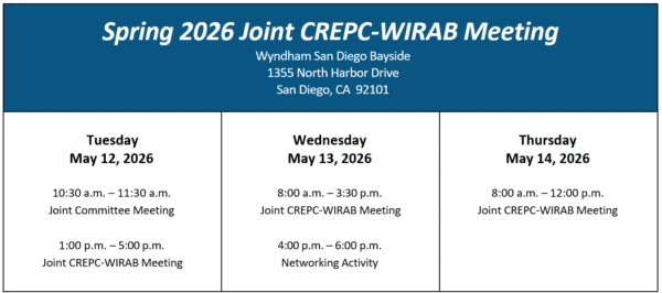 The Spring 2026 Joint CREPC-WIRAB Meeting is coming up soon—Tuesday, May 12 through Thursday, May 14 at the Wyndham San Diego Bayside.